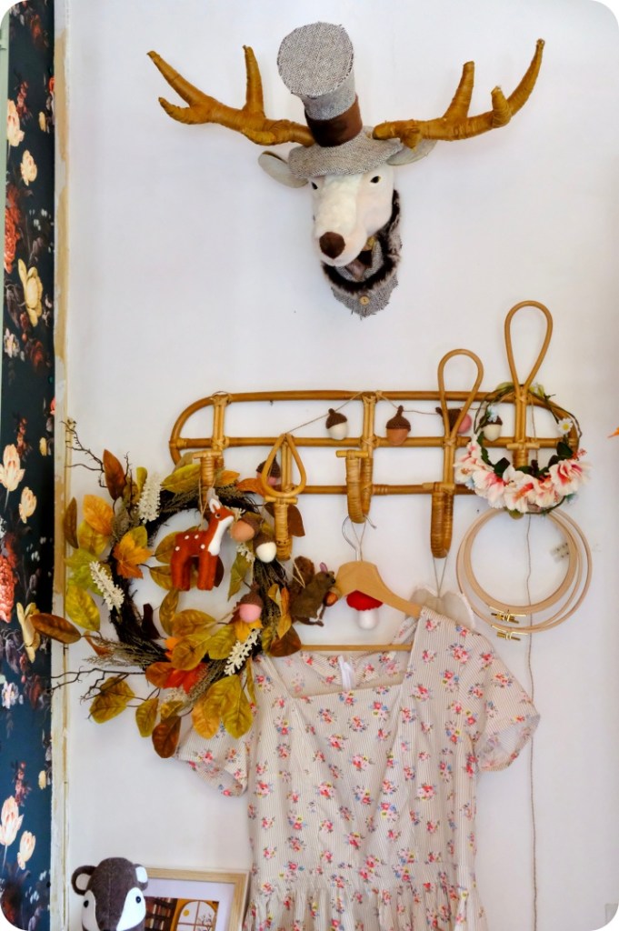 Et j’ai changé encore mon atelier : la décoration, la disposition des meubles, le papier peint avec beaucoup de touches automnales. (Les pieds dans l’été mais la tête dans l’automne 😁).